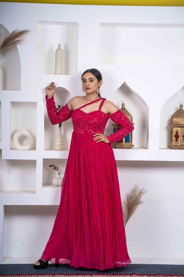 The Embroidered Pink Gown Mother-Daughter Duo Set, made from soft georgette and chiffon fabrics, offers an elegant and heartwarming style for special occasions. This matching set features intricate embroidery, combining grace and charm in a flattering silhouette. Perfect for weddings, receptions, or festive gatherings, it’s designed to create timeless memories with coordinated sophistication.